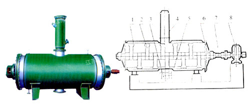 1、殼體 2、耙齒 3、出料裝置 4、加料裝置 5、粉碎棒 6、密封裝置 7、攪拌軸 8、傳動裝置